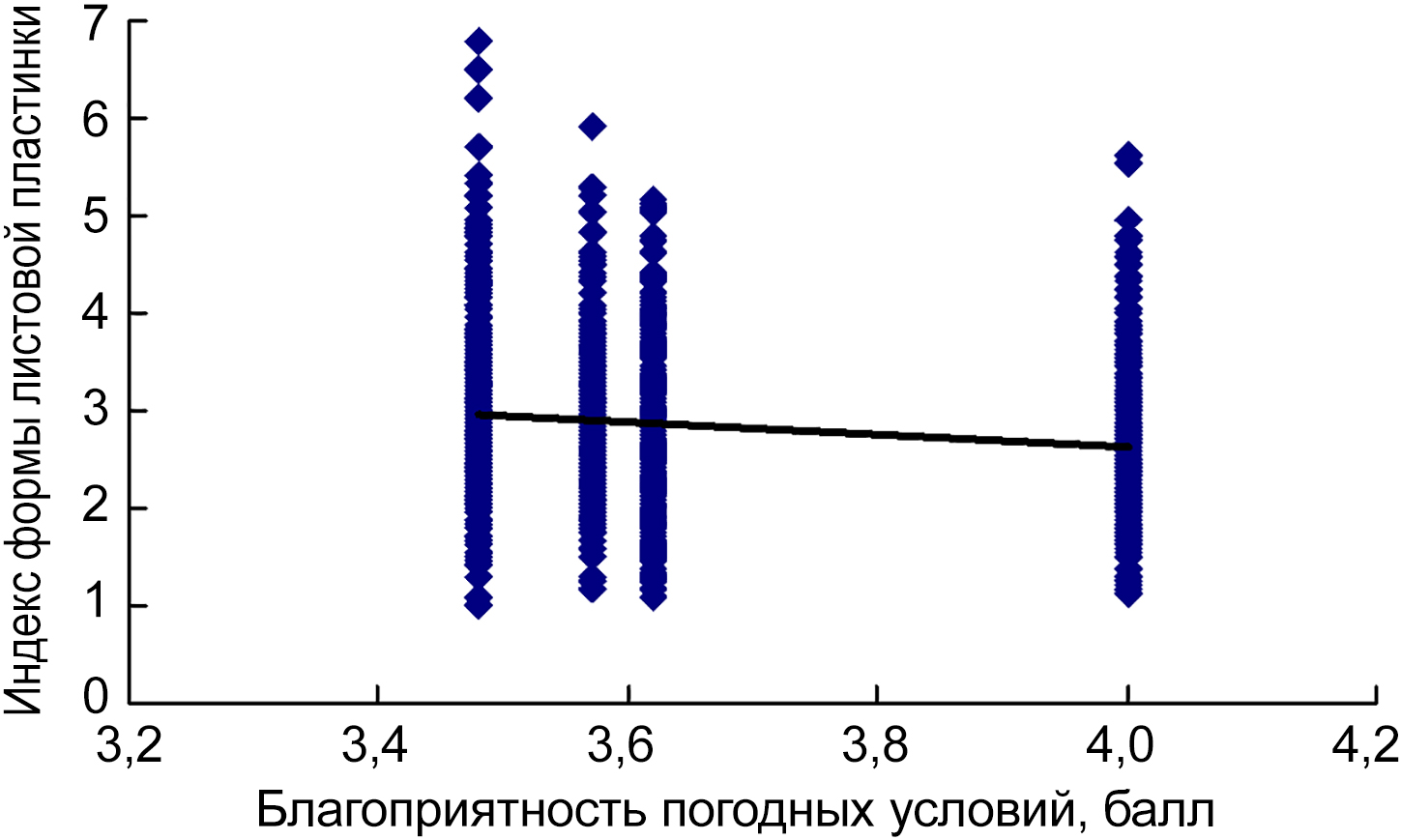 Рисунок 2 – Зависимость индекса формы листовой пластинки от степени благоприятности погодных условий исследуемых лет наблюдения
