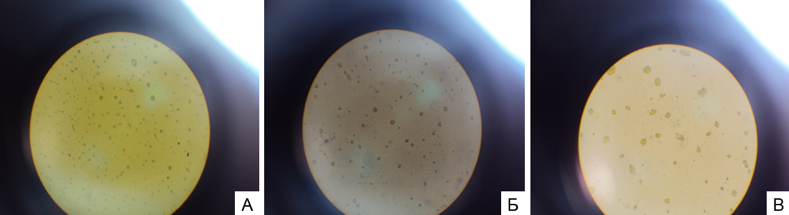 Рисунок 1 – Колония клеток при увеличении 8 × 10 (А), 8 × 15 (Б), 8 × 40 (В)