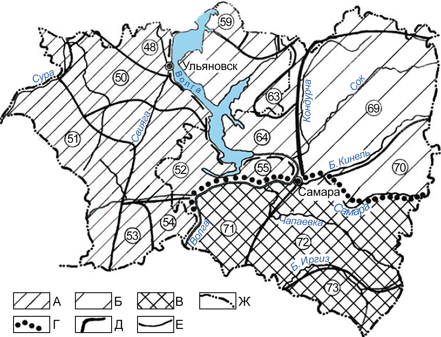 Рисунок 1 – Физико-географические районы Самаро-Ульяновского Поволжья (по [8]): А – лесостепная провинция Предволжья, Б – лесостепная провинция Заволжья, В – степная провинция Заволжья, Г – граница физико-географических зон, Д – граница физико-географических провинций, Е – граница физико-географических районов, Ж – граница Самарской и Ульяновской областей. Физико-географические районы: 48 – Средне-Свияжский, 50 – Корсунско-Сенгилеевский, 51 – Инзенский, 52 – Свияго-Усинский, 53 – Сызранско-Терешкинский, 54 – Южно-Сызранский, 55 – Жигулевский, 64 – Мелекесско-Ставропольский, 69 – Сокский, 70 – Самаро-Кинельский, 71 – Чагринский, 72 – Сыртовый, 73 – Иргизский