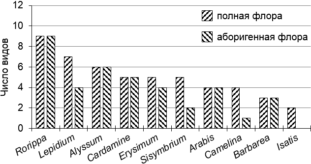 В составе аборигенной фракции род Rorippa остается лидирующим, на втором же месте оказывается род Alyssum. Порядок ранжирования первой десятки родов по числу видов несколько изменяется (рис. 2).