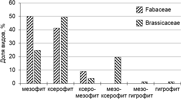 Представители семейства Brassicaceae имеют достаточно широкий экологический спектр. Они часто приурочены к засушливым и сухим местообитаниям, однако есть и представители прибрежно-водной и луговой флоры. Более наглядно экологию крестоцветных иллюстрирует рисунок 3. Можно видеть, что семейство Brassicaceae отличается от Fabaceae большим разнообразием гигроморф.
