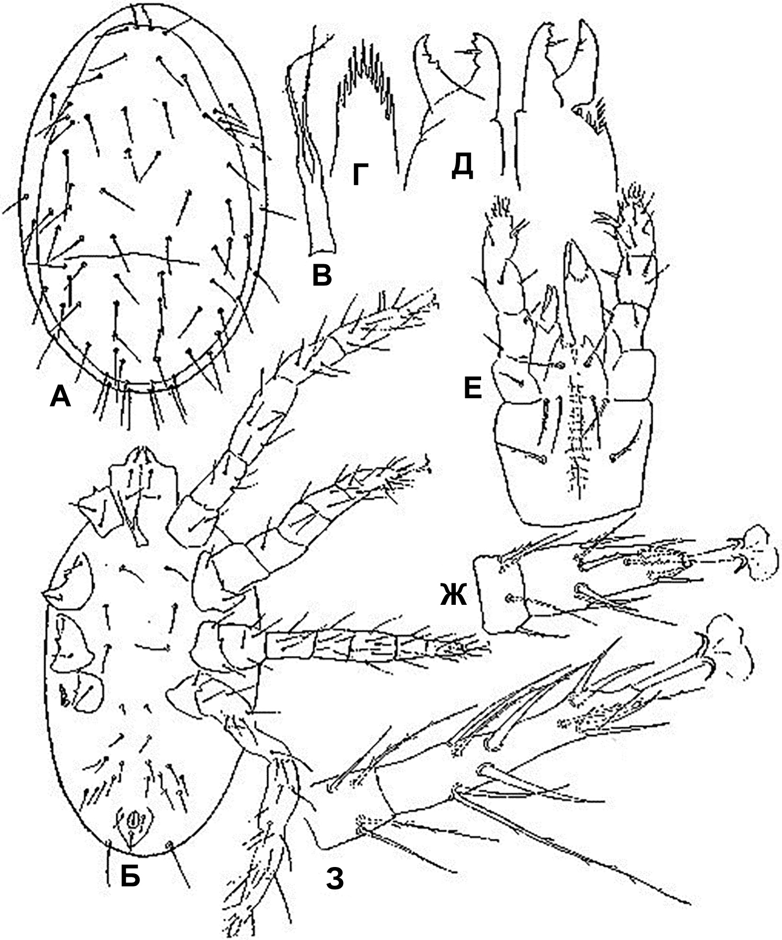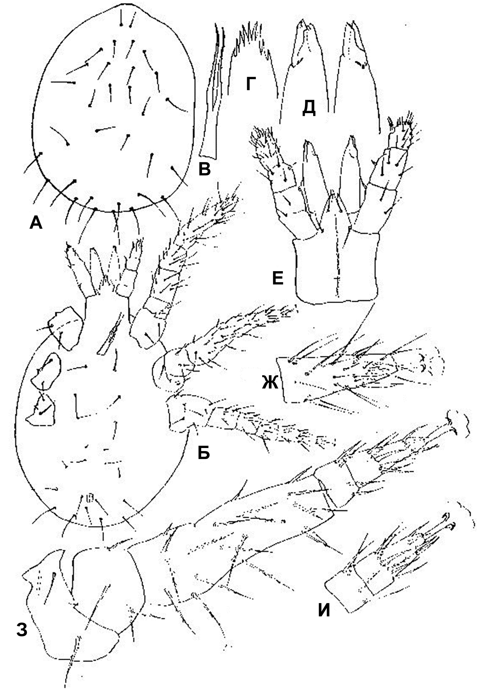 Протонимфа. Длина тела 0,59–0,68 мм. Ширина 0,34–0,47 мм. На дорсальной поверхности тела 36–38 пар хет, причем добавочные хеты расположены несимметрично. Среди хет со следами перистости остальные гладкие (рис. 2: А). На вентральной поверхности, кроме обычных стернальных, метастернальных, абдоминальных и прианальных хет, имеются 4 пары добавочных, которые также располагаются несимметрично (на одной стороне 3, на другой – 4). Перитремы маленькие, расположены на уровне IV кокс (рис. 2: Б). Тритостернум как у личинки (рис. 2: В). Тектум с рассеченной вершиной на 10–12 более или менее длинных остриев (рис. 2: Г). Хелицера очень слабо хитинизирована, однако пальцы хелицер оформлены. Подвижный палец с крючковидной, загнутой вершиной и 2 зубцами на внутренней стороне; неподвижный с расщепленной вершиной и шиповидной формы придатком (рис. 2: Д). Вторые и третьи гипостомальные и гнатосомальные хеты со следами перистости (рис. 2: Е). Некоторые хеты лапок II и IV ног утолщенные (рис. 2: Ж, З).
