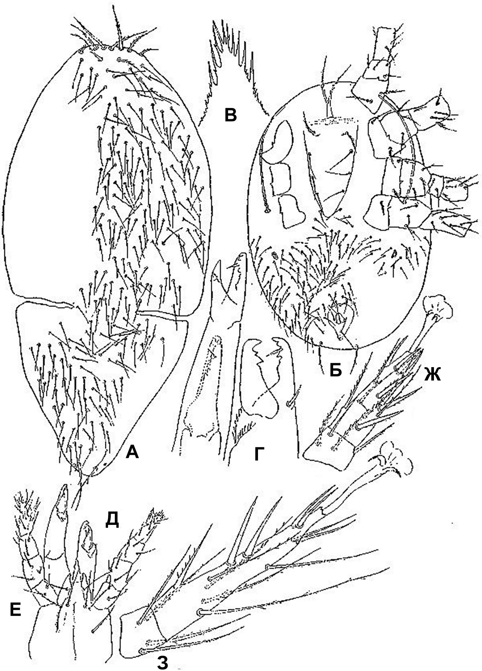 Рисунок 2 – Haemogamasus timofejevi Bujakova et Gontcharova, 1962. Протонимфа: А – дорсальная сторона, Б – вентральная сторона, В – тритостернум, Г – тектум, Д – хелицеры, Е – гнатосома, Ж – вторая нога, З – четвертая нога