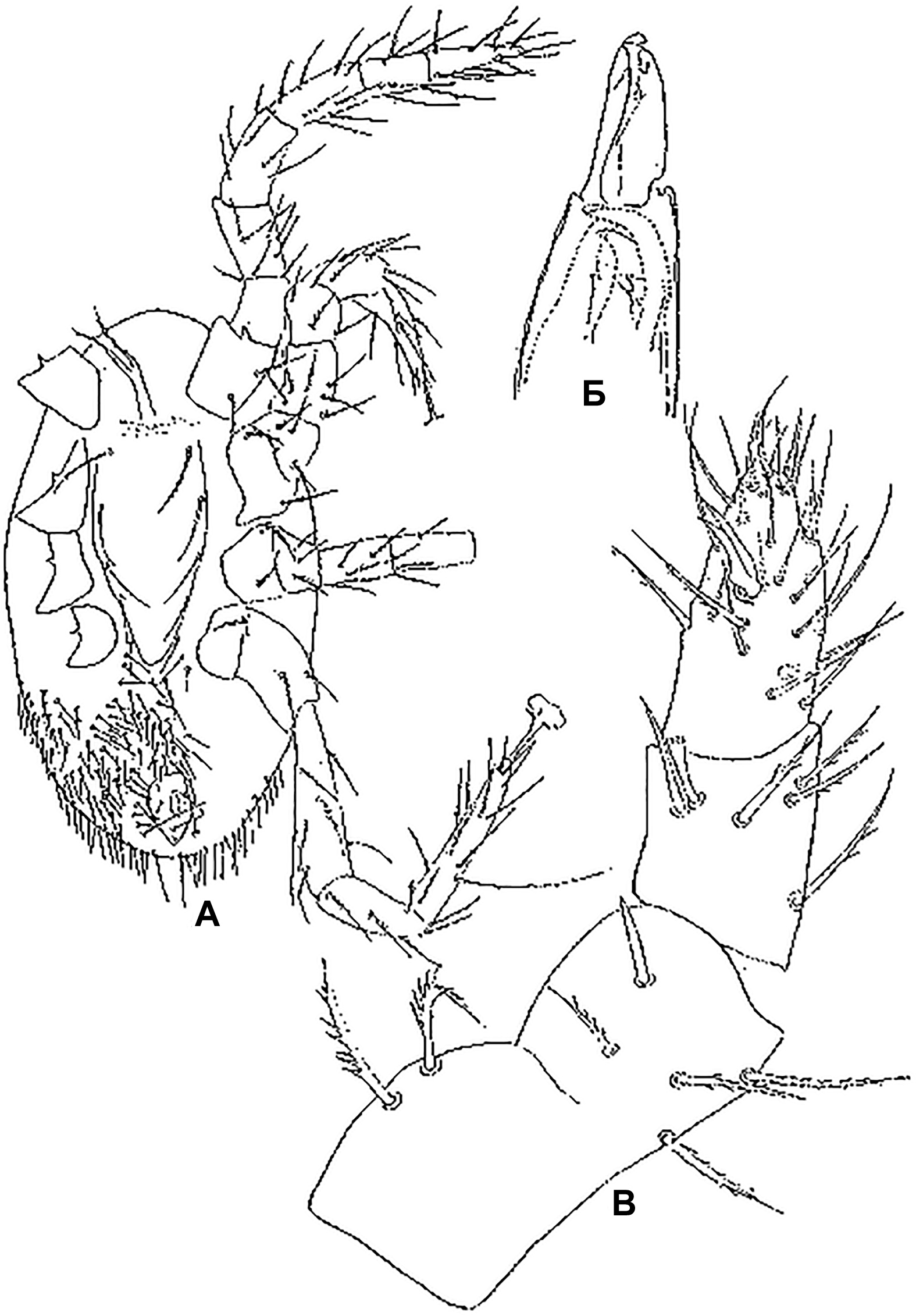 Рисунок 4 – Haemogamasus timofejevi Bujakova et Gontcharova, 1962. Дейтонимфа мужская: А – вентральная сторона, Б – хелицера, В – лапка
