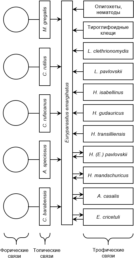 E. emarginatus широко распространен среди грызунов и насекомоядных в Забайкальской северо-восточной тайге [16]. В природном биоценозе лесостепной зоны E. emarginatus обнаружен в гнездах узкочерепной полевки, лесных полевок, азиатской лесной мыши, хомячка. Его встречаемость в гнездах этих грызунов от 10% до 33%. В гнездах отмечены все стадии развития этого клеща с некоторыми числовыми преобладанием самок. Это дает основание считать возможным формирование в гнездах популяций. На зверьках встречаются в основном дейтонимфы, выполняющие функцию расселения клеща [17]. В природном биоценозе трофическая связь этого вида сложнее, с включением более-менее большого вида червей и особенно клещей (рис. 5). В трофической связи с гамазидами отмечены некоторые особенности взаимоотношений E. emarginatus с паразитическими видами, различными по форме гематофагии [18]. Исключительные гематофагии являются для E. emarginatus лишь объектами питания, факультативные гематофагии тоже объекты его питания, но они также и враги, пожирающие личинок и нимф данного вида [19].