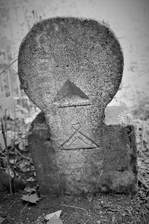 Во-вторых, такому же переосмыслению подвергся треугольный знак лика человека на памятнике. На «классических», т.е. старых надгробиях, он всегда располагается в верхней части и всегда острием вниз, а на более поздних его расположение иногда допускается острым концом верх (рис. 7). Кроме этого одним из излюбленных способов становится размещение данного треугольного знака в центре головы памятника, если последний выполнен в виде фигуры человека.