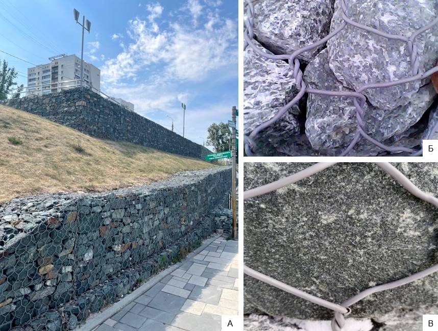 Первой точкой наблюдения является ограждение дорожки для инвалидов в виде стенки из глыбовых обломков, закрепленных в проволочных металлических сетках (рис. 2: А). Обломки являются природным каменным материалом размером от 10 до 25–30 см в поперечнике. По цвету, структуре и текстуре они относятся к магматическим и метаморфическим породам.