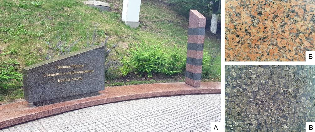 Рисунок 3 – Памятник Государственной границе России (А – внешний вид памятника, Б – гранит, В – габбро). Фото М.Н. Барановой