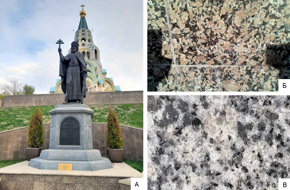 Рисунок 4 – Памятник князю Владимиру (А – внешний вид, Б – уральский гранит, В – сиенит). Фото М.Н. Барановой