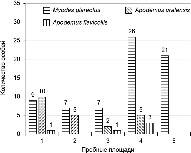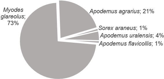 За время исследования было отловлено 5 видов мелких млекопитающих отряда грызуны (Rodentia). Доминантом на всех пробных площадях является рыжая полевка (Myodes glareolus – 73% в целом), кодоминантом – лесная мышь (Apodemus uralensis – 21%) (рис. 1). Желтогорлая мышь (Apodemus flavicollis) малочисленна и встречается лишь на отдельных пробных площадях, полевая мышь (Apodemus agrarius) и обыкновенная бурозубка (Sorex araneus) отмечены единично.