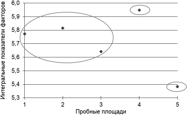 Пробные площади 4 и 5 несколько выбиваются из общей картины, что позволяет выделить их в самостоятельные кластеры. Так, пятая пробная площадь характеризуется самым низким богатством почвы по содержанию азота и наименьшим показателем влажности, тогда как четвертая – наибольшим почвенным богатством по азоту и средними показателями влажности и освещенности.