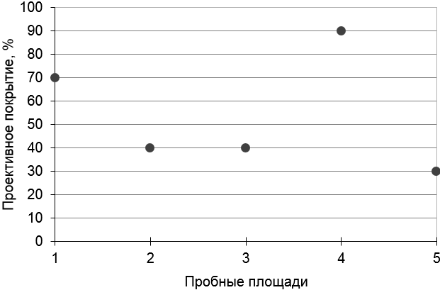 Показатели проективного покрытия для исследованных пробных площадей приведены на рис. 3. Пробные площади 4 и 5 отличаются.