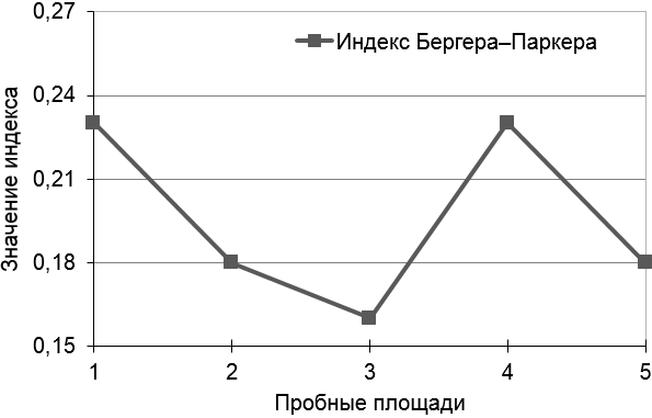 Для оценки возможного влияния на микротинных грызунов характера растительного покрова была проведена оценка биологического разнообразия растительных сообществ по выровненности, а именно – с использованием индекса доминирования (индекс Бергера–Паркера). Некоторые экологи считают указанный индекс лучшей мерой биоразнообразия [22]. Результаты приведены на рис. 4.