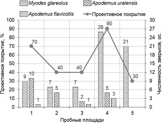 Рыжая полевка встречается как при очень высоких (90%), так и при низких (30%) значениях проективного покрытия растительности на пробных площадях, что подтверждает экологическую пластичность данного вида. Для мышей – желтогорлой и полевой – оптимальные значения проективного покрытия лежат в диапазоне от 70 до 90%, однако желтогорлая может обитать и в ассоциациях с показателем проективного покрытия 40–50%, что подтверждает ее экологическую роль «сильного конкурента».