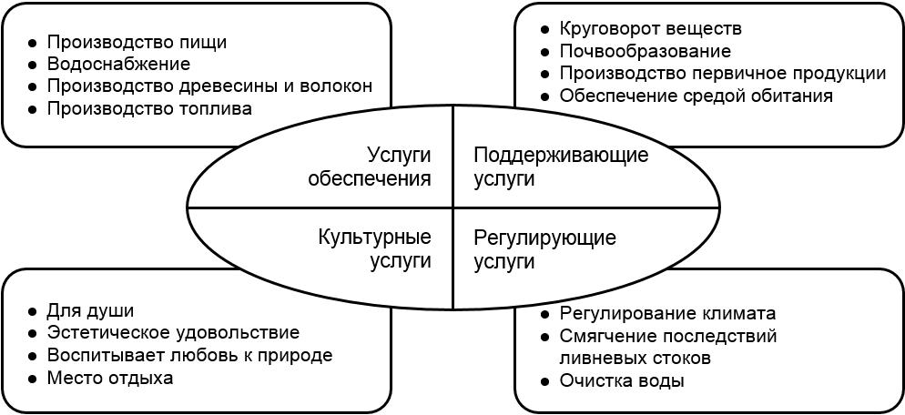 Экологические процессы вызывают эффекты, которые оцениваются как экосистемные услуги или вредные воздействия в зависимости от их значения, то есть причиняемых населению и его имуществу пользы или вреда. Эта оценка в конечном счете зависит от того, что заинтересованные лица в данных обстоятельствах считают полезным или вредным для своего благополучия. Экосистемные услуги и экосистемные «медвежьи услуги» подвержены социальным и экономическим, а также экологическим воздействиям [6, p. 199]. Особенно это касается воздействия городских экосистем на качество жизни горожан, так как это влияние затрагивает многих людей.