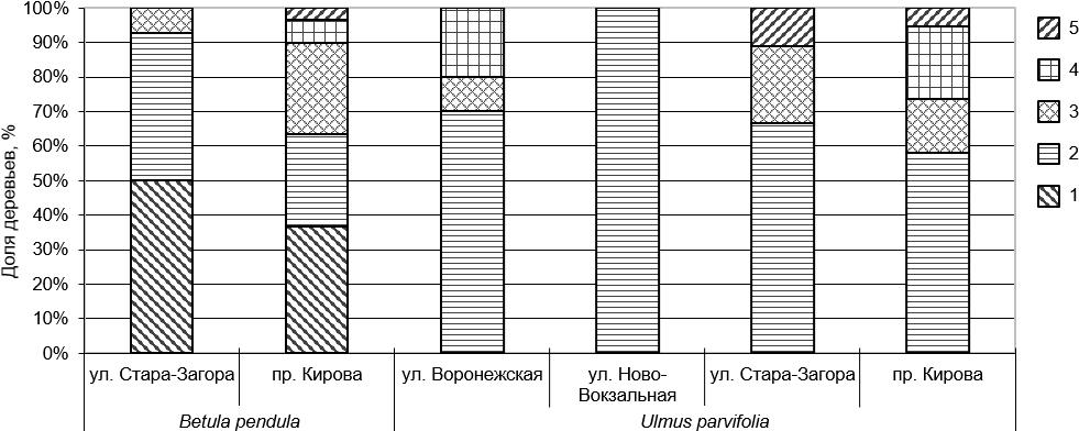 Рисунок 2 – Показатели жизненного состояния деревьев Betula pendula Roth и Ulmus parvifolia L. на модельных участках по шкале В.А. Алексеева