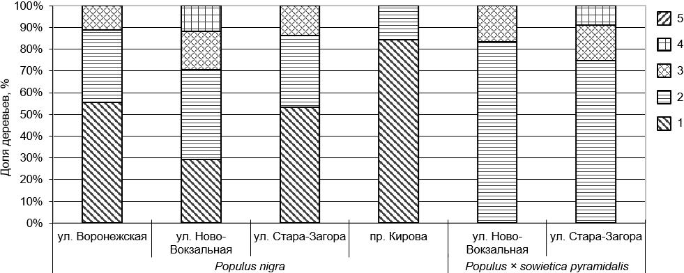 Рисунок 3 – Показатели жизненного состояния деревьев Populus nigra L. и Populus × sowietica pyramidalis Lauche на модельных участках по шкале В.А. Алексеева