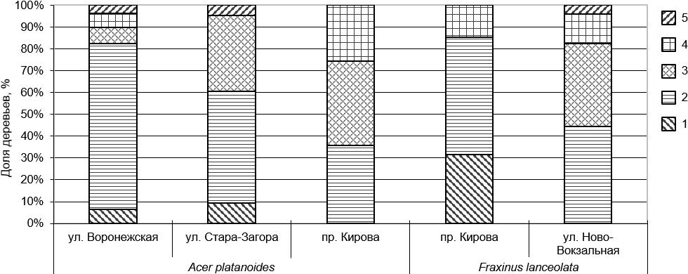 Рисунок 4 – Показатели жизненного состояния деревьев Acer platanoides L. и Fraxinus lanceolata Borkh. на модельных участках по шкале В.А. Алексеева