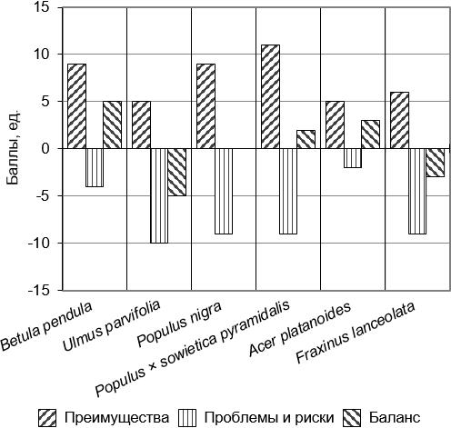 На рис. 5 мы продемонстрировали итоговую оценку услуг древесных растений, выражающую итоговое соотношение положительного и отрицательного вклада в состояние урбосреды. Наиболее высокий положительный итоговый балл получила Betula pendula, ей уступают Acer platanoides и Populus × sowietica pyramidalis. Наибольшее количество баллов отрицательного влияния оказалось у Fraxinus lanceolata и особенно Ulmus parvifolia. Для Populus nigra положительный и отрицательный вклад практически равны, итоговая балльная оценка стремится к нулю. Прокомментируем эти результаты, обращая внимание на то, что каждый вид древесного растения в озеленения города вносит неоднозначный вклад в формирование городской среды.