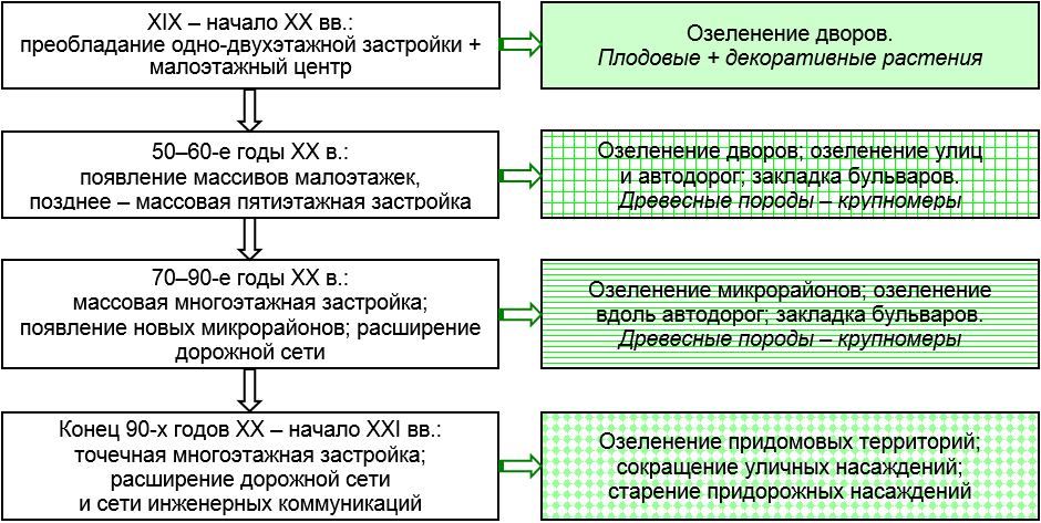 Моментом, на котором мы хотели бы остановиться в завершение данной статьи, является тот факт, что сама городская среда претерпевает развитие, связанное с изменением характера застройки и развития транспортных систем и инженерных коммуникаций. Это отчетливо проявляется на примере г. Самары, пережившей многократные рост населения и территории во второй половине XX в., достигнувшей за сравнительно короткий отрезок времени статуса крупного индустриального центра и города-миллионника. На схеме, представленной на рис. 6, мы сделали попытку кратко отразить особенности городского строительства и сопутствовавших ему систем озеленения в г. Самаре с конца XIX в. по начало XXI в. Можно отметить, что именно в начальный период зеленая инфраструктура обеспечивала реализацию всех групп экосистемных услуг, включая и обеспечивающие услуги (придомовые сады горожан). Позднее многократно усилилась значимость регулирующих услуг, направленных на смягчение микроклимата (ослабление летнего зноя, формирование тени, повышение влажности воздуха), ослабление шума, поглощение компонентов техногенного загрязнения воздуха. Естественным образом по мере роста населения актуализировалась необходимость обеспечения отдыха и культурного развития горожан (культурные услуги). В современном городе, к сожалению, мы переживаем период естественной утраты многих компонентов «старой» системы озеленения, что стало результатом ускоренного старения древесных растений при хроническом, повторяющемся воздействии негативных абиотических факторов и антропогенного загрязнения. Свой вклад в угнетение состояния деревьев на городских улицах внесли сезоны с экстремальными погодными условиями (например, массовое выпадение деревьев Betula pendula после засушливого лета 2010 г.).