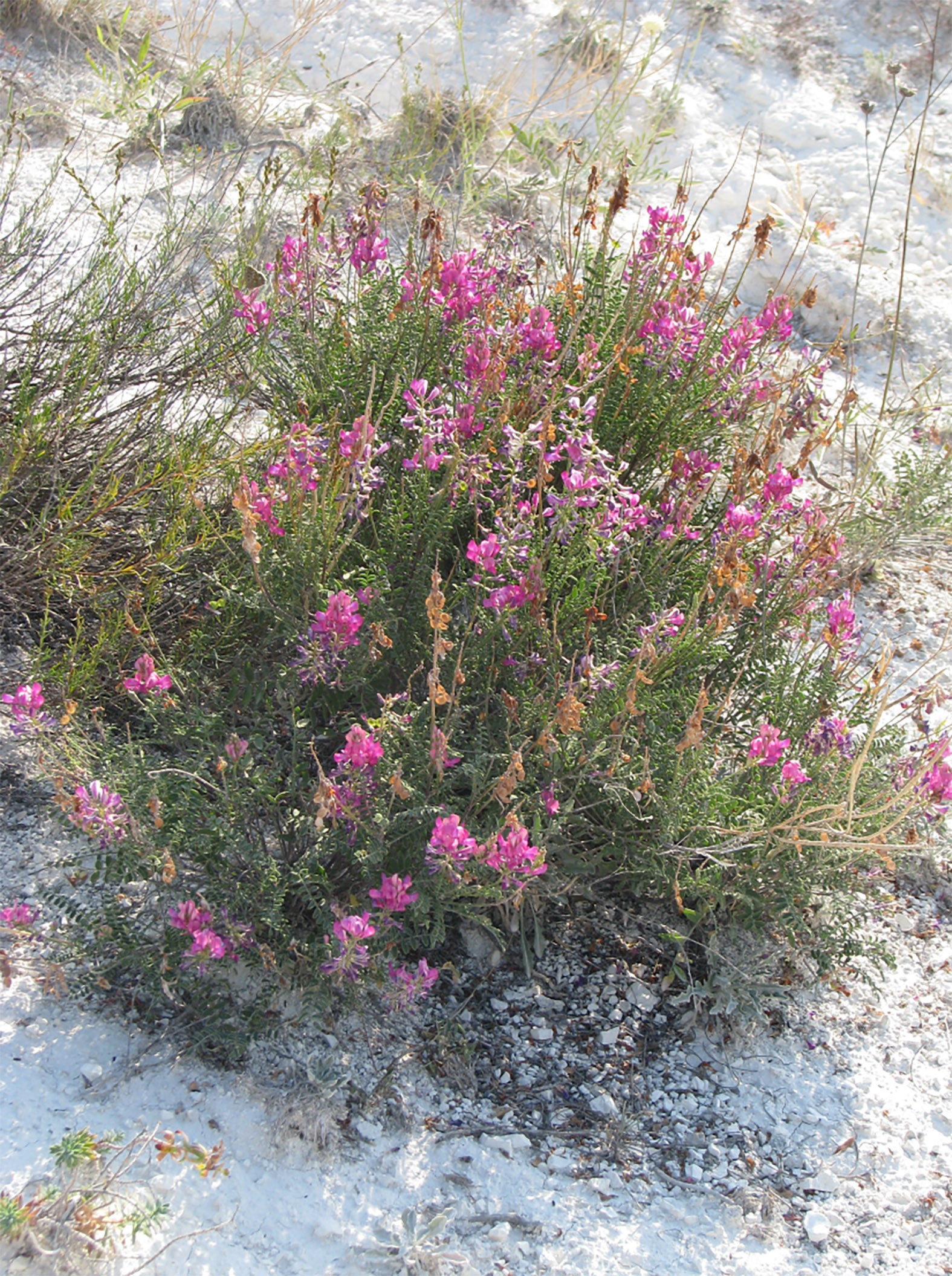 Целью работы являлось определение основных параметров популяционной структуры редких и уязвимых представителей рода Hedysarum в степях Поволжья и Приуралья. Это позволило получить значимые результаты изучения пространственной и онтогенетической структуры ценопопуляций пяти представителей степной флоры Поволжья и Приуралья: H. argyrophyllum Ledeb. (копеечник серебристолистный), H. cretaceum Fisch. (к. меловой), H. gmelinii Ledeb. (к. Гмелина), H. grandiflorum Pall. (к. крупноцветковый) и H. razoumowianum Fisch. еt Helm (к. Разумовского) (рис. 1–5).