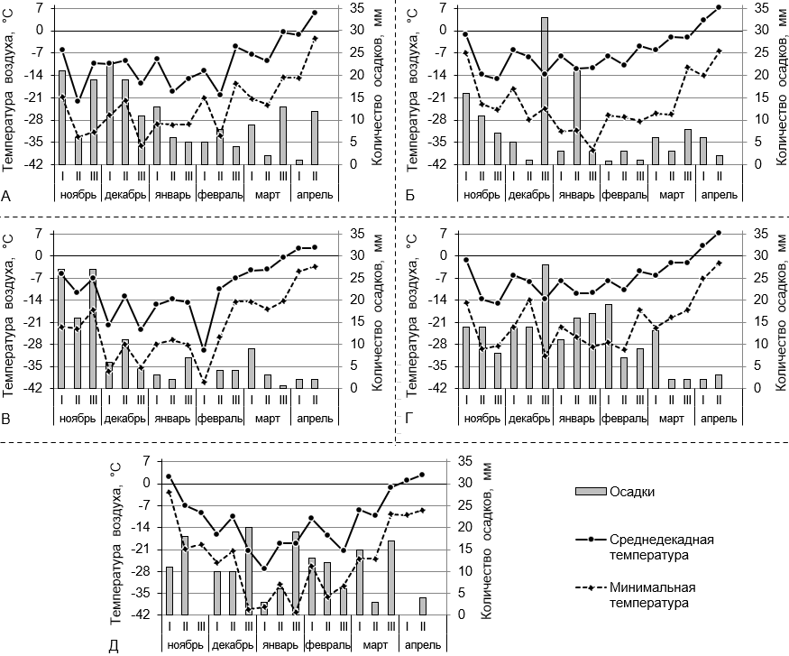 Рисунок 1 – Условия перезимовки растений в Новосибирске за 2016–2021 гг.: А – 2016/2017 гг., Б – 2017/2018 гг., В – 2018/2019 гг., Г – 2019/2020 гг., Д – 2020/2021 гг.