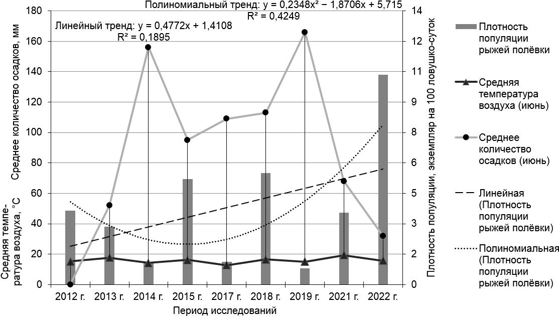 Рисунок 2 – Оценка популяционной динамики рыжей полёвки в период 2012–2022 гг. в зависимости от погодно-климатических факторов на территории ГПЗ «Кологривский лес» (ельник-липовый)