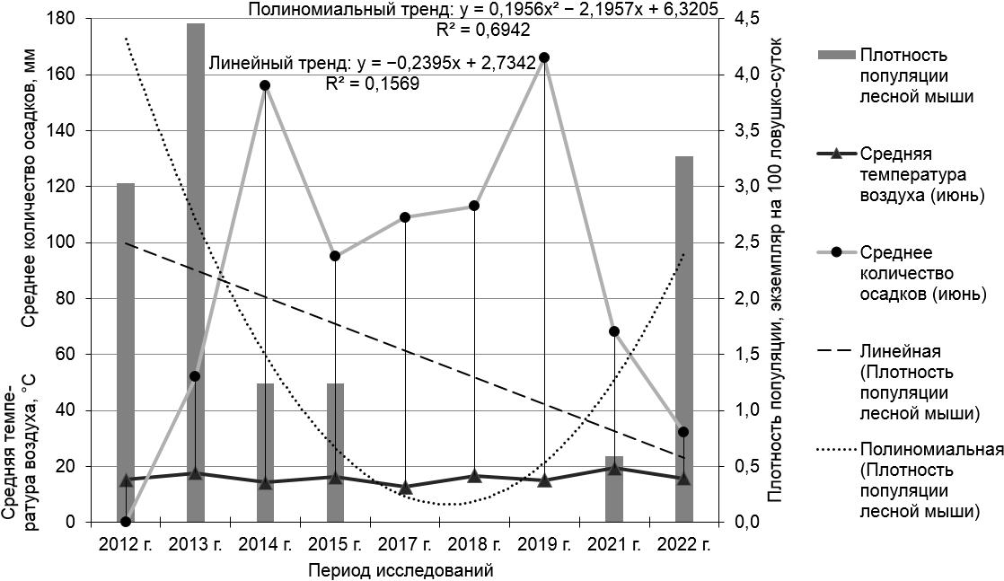 Рисунок 3 – Оценка популяционной динамики лесной мыши в период 2012–2022 гг. в зависимости от погодно-климатических факторов на территории ГПЗ «Кологривский лес» (ельник-липовый)
