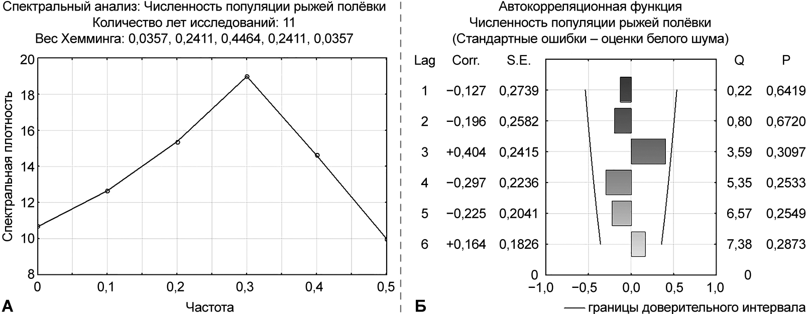 Спектральный анализ плотности популяции рыжей полёвки показывает единственный максимум спектральной плотности, соответствующей рассматриваемому периоду (рис. 4: А). Сходные результаты дал автокорреляционный анализ (рис. 4: Б).