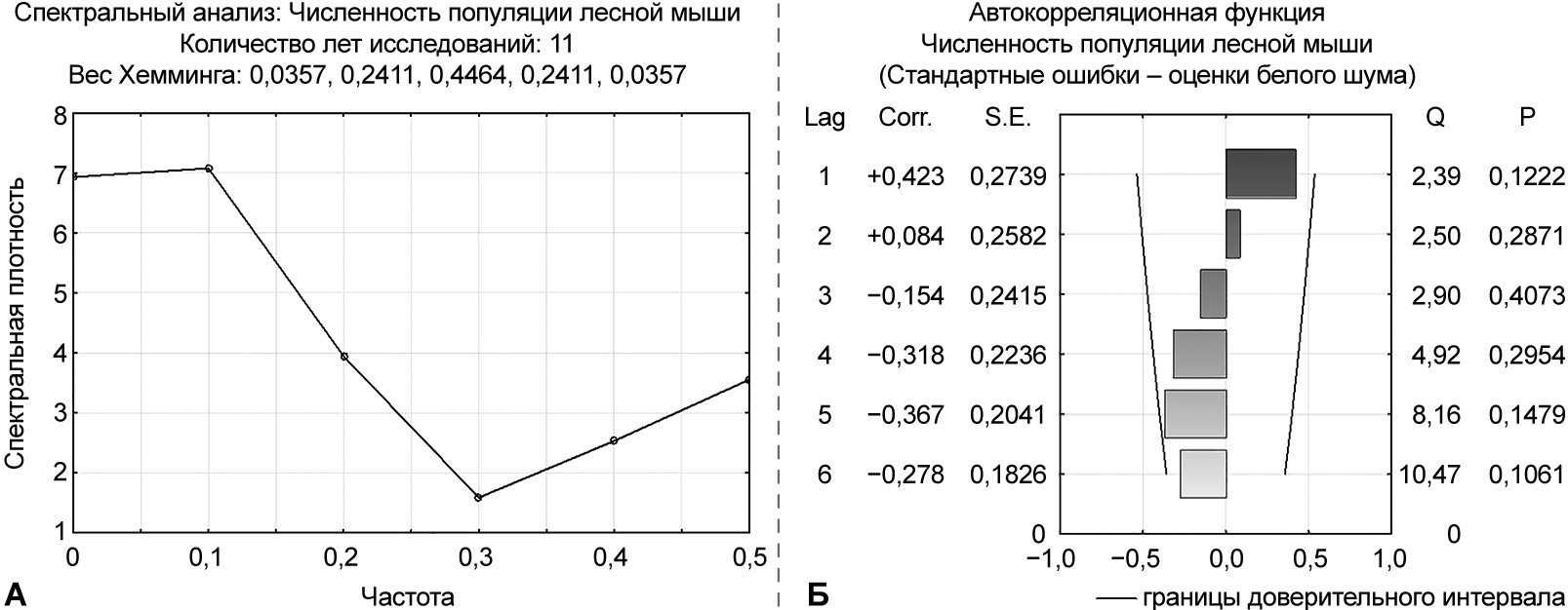 Спектральный анализ плотности популяции лесной мыши не показывает достоверной многолетней цикличности в их динамике численности (рис. 5: А). Сходные результаты дал автокорреляционный анализ (рис. 5: Б).