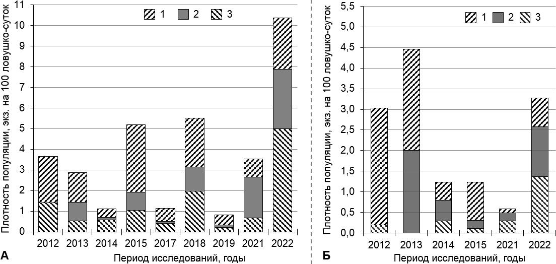 Рисунок 6 – Динамика численности и возрастной структуры популяции рыжей полёвки (А) и лесной мыши (Б) на участке южной тайги Кологривского заповедника: 1 – juvenis (неполовозрелые сеголетки), 2 – subadultus (половозрелые сеголетки), 3 – adultus (перезимовавшие особи)