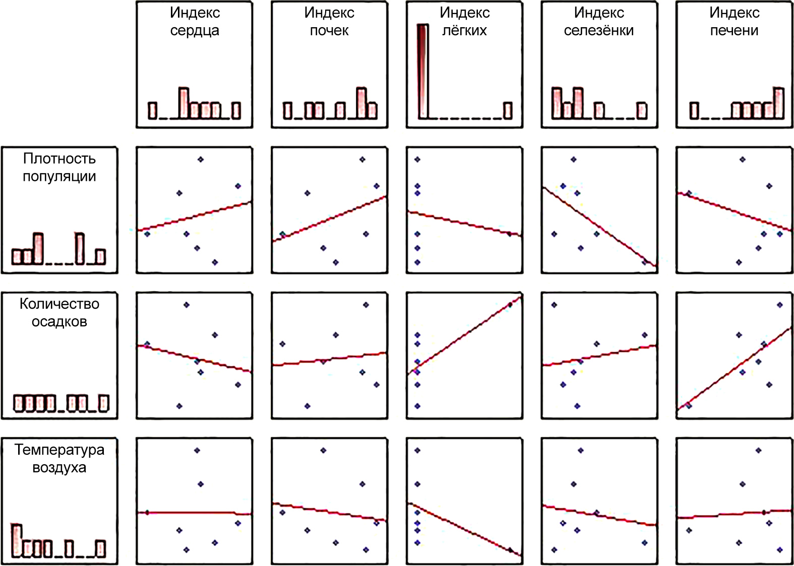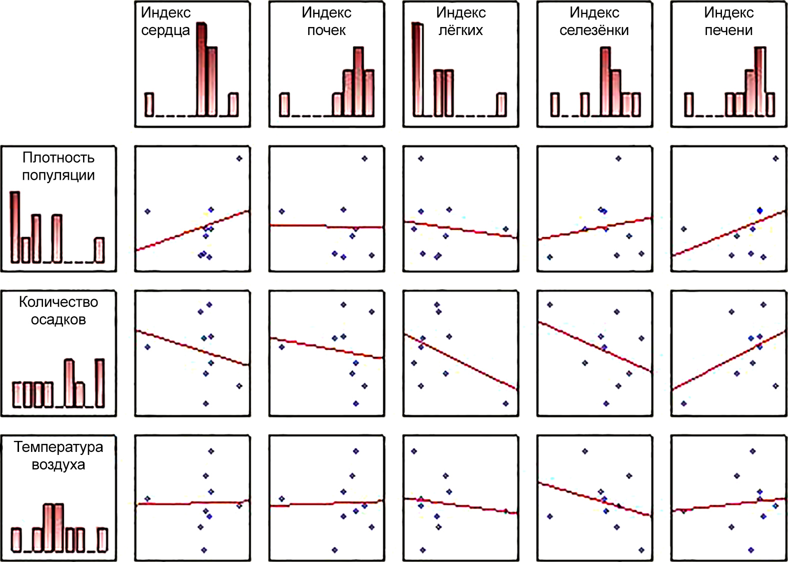 Рисунок 8 – Оценка корреляционных зависимостей индексов внутренних органов особей от плотности популяции лесной мыши и погодно-климатических факторов на территории ГПЗ «Кологривский лес» (p < 0,05)