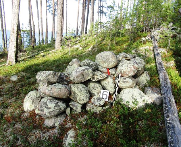 Объективно наши знания о валунных сложениях незначительны. Раскопки сооружения озера Окунёвое не выявили углубления в грунте под камнями, имитирующего могильную яму. Но встречается и противоположная ситуация, как, например, было прослежено на комплексе Ниэмеленхови I в Северном Приладожье [7]. Также нельзя установить, дополняли ли каменные сооружения конструкции из дерева (перекрытия, столбы, «домики мертвых», ограда и т.п.), проводились ли какие-то ритуальные действия, маркировался ли специальными знаками-символами на деревьях-карсикко участок их местонахождения [8]. Мы не имеем находок, которые позволили бы ответить на вопросы их датирования и культурной принадлежности.