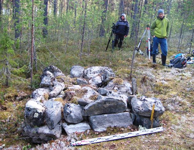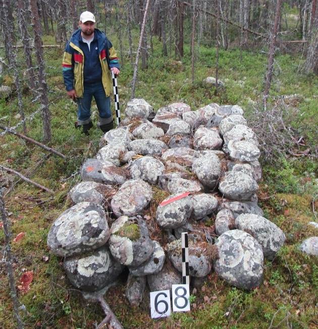 Перечень памятников в Восточной Фенноскандии, подобных вышеописанным, можно расширить. Например, включить в него группу каменных сложений на реке Ура около п. Килпъявр (Кольский р-н Мурманской обл.). Семь каменных кладок (1 × 1,7 × 0,6–1,2 м) располагаются двумя рядами по линии запад – восток, на удалении 3–14 м друг от друга и, вероятно, представляют единый комплекс. Они в плане квадратной, треугольной, трапециевидной формы, сделаны из крупных валунов с укладкой более мелкого камней в центре конструкций. Одно сооружение увенчано вертикально установленным камнем. При их осмотре находки не найдены. Памятник предположительно определен как погребальный или культовый [3, с. 64]. Раскопки подобного сооружения в бассейне р. Дроздовка на восточном побережье Кольского п-ова в 1985 г. не дали дополнительной информации.