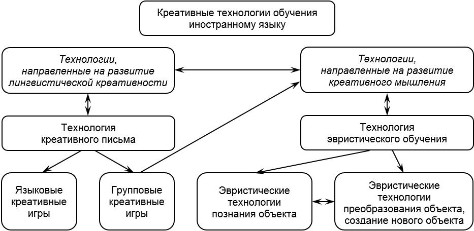 - К креативным технологиям обучения иностранному языку относятся педагогические технологии развития лингвистической креативности и технологии развития креативного мышления.