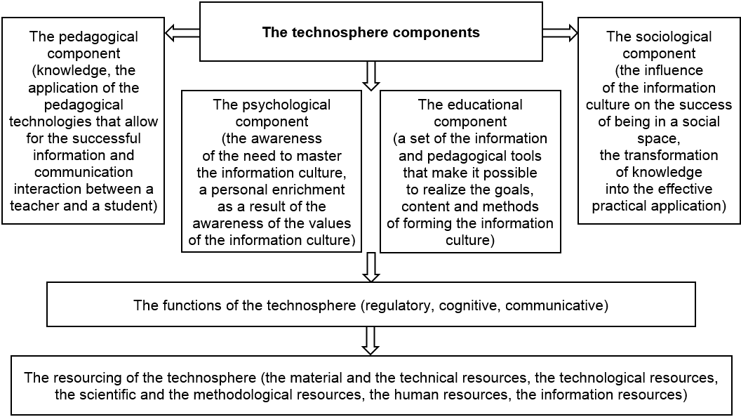The authors believe that the effectiveness of the teacher’s information culture developed components is determined through the functional purpose of the university technosphere. In the proposed model, we have outlined the importance of the technosphere regulatory, cognitive and communicative functions, since they are of the greatest relevance in the context of modern society cyber socialization.