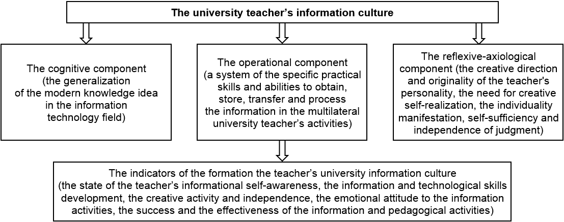 Being one of the components of the general and professional university teacher’s culture, the information culture can be considered as a person’s complex ability who is able to master, assimilate, process information using the information technologies and practically apply these skills [19].