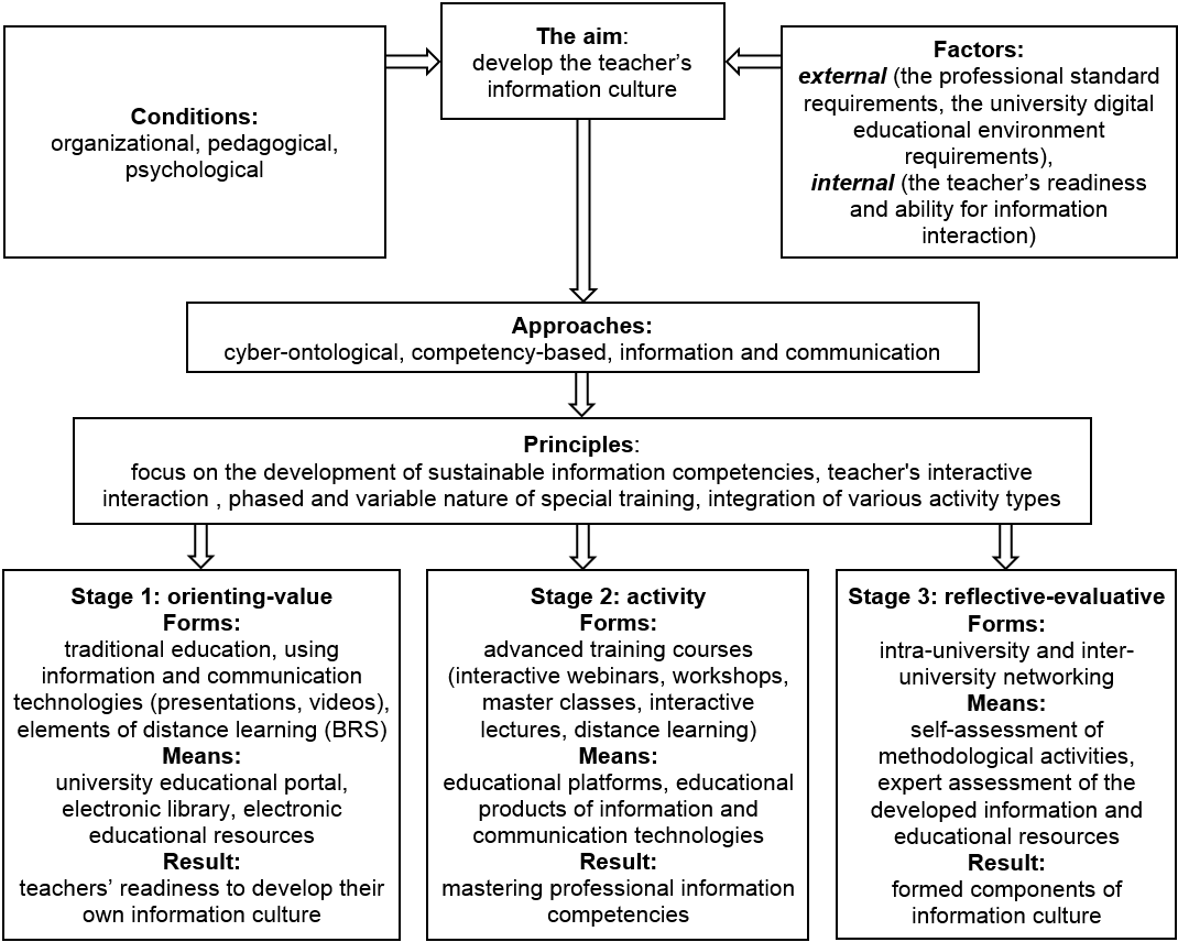 The development of the teacher’s information culture involves a certain sequence, which is comprised of three stages. The following stages are distinguished in our model: the orienting-value, activity-oriented and reflective-evaluative stages.