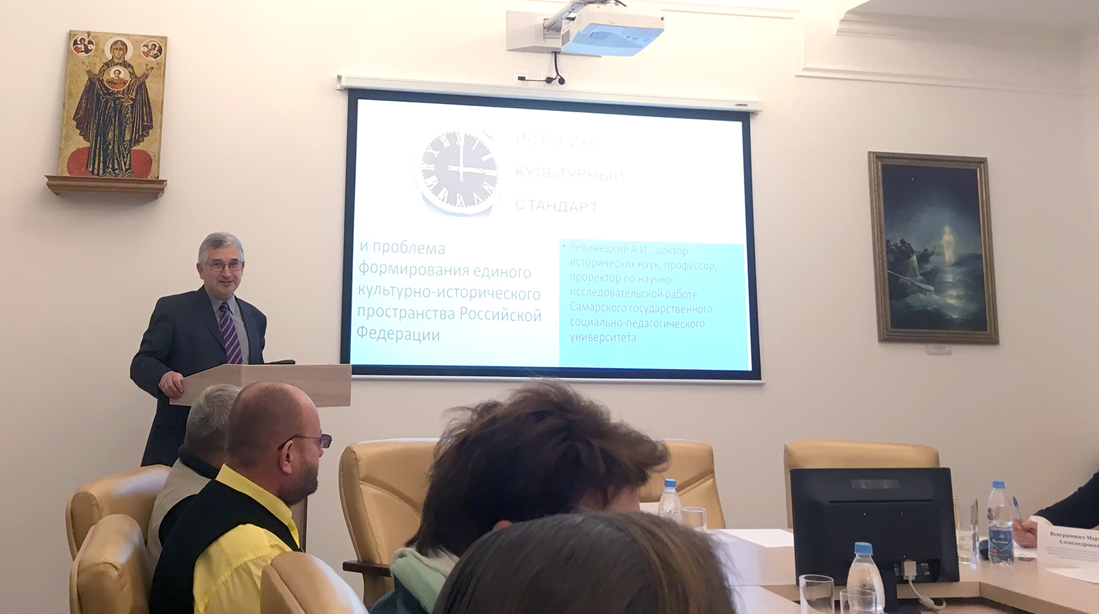 Рисунок 4 – А.И. Репинецкий выступает с докладом на круглом столе «Историко-культурный стандарт как база формирования единого культурно-исторического пространства Российской Федерации: проблемы и формы реализации», посвящённом проблемам изучения и преподавания истории (2018 г.)