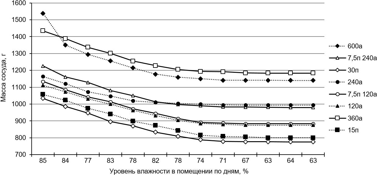 Все сосуды прошли этап естественной сушки. Процесс проходил в одном помещении с контролем влажности. У отобранной группы из восьми сосудов с разным составом примеси ежедневно в течение двух недель измерялся массу для составления графика по скорости потери влаги. Так как глина была стандартной фасовки, различия в исходной массе определялись объемом добавленной примеси и воды.