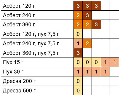 | Глина, г | Пух, г | Асбест, г | Дресва, г |