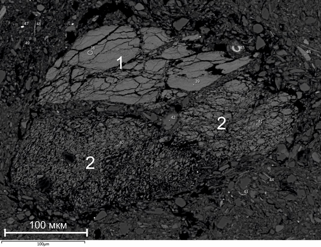 Химический состав определялся на приборе Hitachi S-3400N с EDX приставкой (РЦ Геомодель НП СПбГУ).
