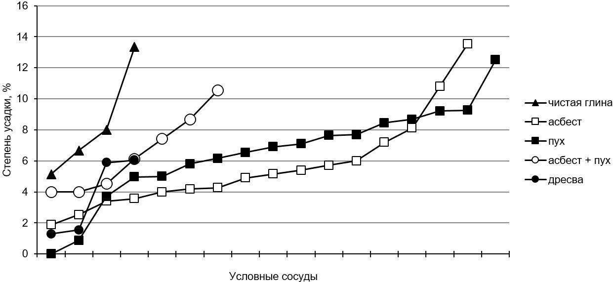 В плане усадки при сушке и обжиге лучше всего себя повела примесь дресвы, у сосудов с этой примесью степень усадки минимальна. Можно предположить, что фактор минимизации вредного влияния усадки стоял особенно остро при изготовлении крупных толстостенных сосудов (напр., типичная гребенчато-ямочная керамика), которые легко могли разрушиться под собственным весом. Широкое распространение асбестовой керамики приходится на период, когда размер сосудов становится меньше (см., напр., [9]) и, вероятно, минимизация усадки уже не так актуальна.