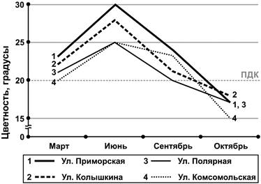 Значения цветности питьевой воды в 2017 г. располагались в пределах 15–30 град. (норматив по СанПиН 2.1.4.1074-01 – 20 град.) [14, с. 61]. Максимальное повышение цветности воды зафиксирована в июле на ул. Приморская – 30 град. (рис. 1). Высокие показатели цветности отмечаются в летний период, а также видна тенденция к понижению цветности воды в осенне-зимний период.