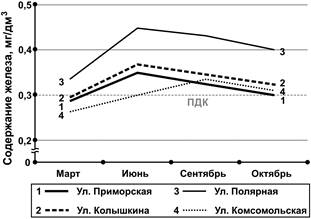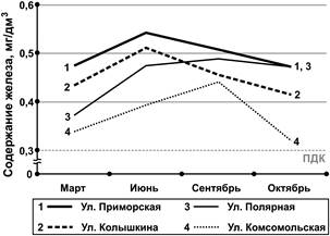 Из рисунков 2 и 3 видно, что за 2017–2018 гг. содержание железа в питьевой воде за 4 квартала практически во всех пробах воды превышает нормы ПДК, наибольшее превышение наблюдается в летние месяцы. Концентрация общего железа в питьевой воде за 2017–2018 гг. колебалась в пределах 0,26–0,54 мг/дм³ (норматив по СанПиН 2.1.4.1074-01 – 0,3 мг/дм³) [15]. Максимальные значения отмечались в июне 2018 г. на ул. Приморская – 0,54 мг/дм³ и превышала границу ПДК в 1,8 раза (рис. 3).