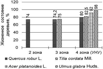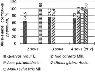 Полученные данные показывают, что интенсивная антропогенная нагрузка сильно сказывается на жизненном состоянии древесных пород. Самое лучшее ЖС у Acer platanoides L. (88–92%), низкое – у Quercus robur L. (64,5–80%). Следовательно, Acer platanoides L. более устойчивая порода. Полученные данные свидетельствуют, что рекреационное воздействие оказывает влияние на жизненное состояние древостоев. С увеличением рекреационного воздействия ЖС пород ухудшается.