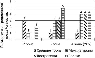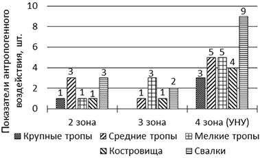 Вдоль зон экологического профиля визуально оценивалась степень развития таких показателей антропогенного воздействия, как площадь тропиночной сети, численность костровищ и свалок. Эти критерии вносят коррективы при определении протяжённости каждой зоны профиля и могут свидетельствовать о степени выраженности рекреационной нарушенности сообществ (рис. 3, 4; табл. 1).