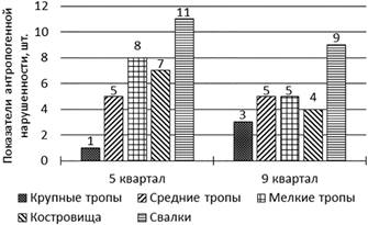 Тропиночная сеть развита, что может быть объяснено рядом расположенными коттеджами и дачами. Количество мелких троп меньше, чем крупных и средних. В пределах 1 км среднее количество троп составляет 13,5, костровищ – 5,5, свалок мусора – 10 (рис. 5).