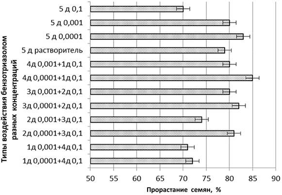 На рис. 1 представлены суммированные результаты экспериментов по выяснению возможности создания преадаптации растений к токсичной дозе бензотриазола в концентрации 0,1 мг/мл его же низкими дозами. Биологический ответ оценивали по такому физиологическому показателю, как всхожесть, подсчитывая изменение прорастания семян в различных сериях эксперимента.