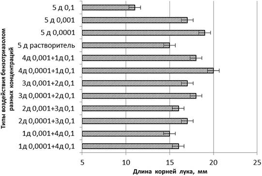 Всхожесть семян – это интегральный физиологический показатель состояния растения, зависящий от многих показателей: целостности семенной кожуры, веса семени, влажности и т.п. Поэтому необходимо исследование адаптивного ответа, являющегося частным случаем гормезиса, на более конкретные параметры состояния растения, например рост корней лука. Многие исследователи используют корни как тест-объекты анализа биологического действия токсикантов [17, с. 944–952], поэтому мы измеряли среднюю длину корней во всех сериях экспериментов и сравнивали полученные результаты между собой с целью выявления способности у низких доз бензотриазола создать преадаптации к токсическому действию его высокой дозы (0,1 мг/мл) для ростовых процессов. Результаты проведенных экспериментов показаны на рис. 2.